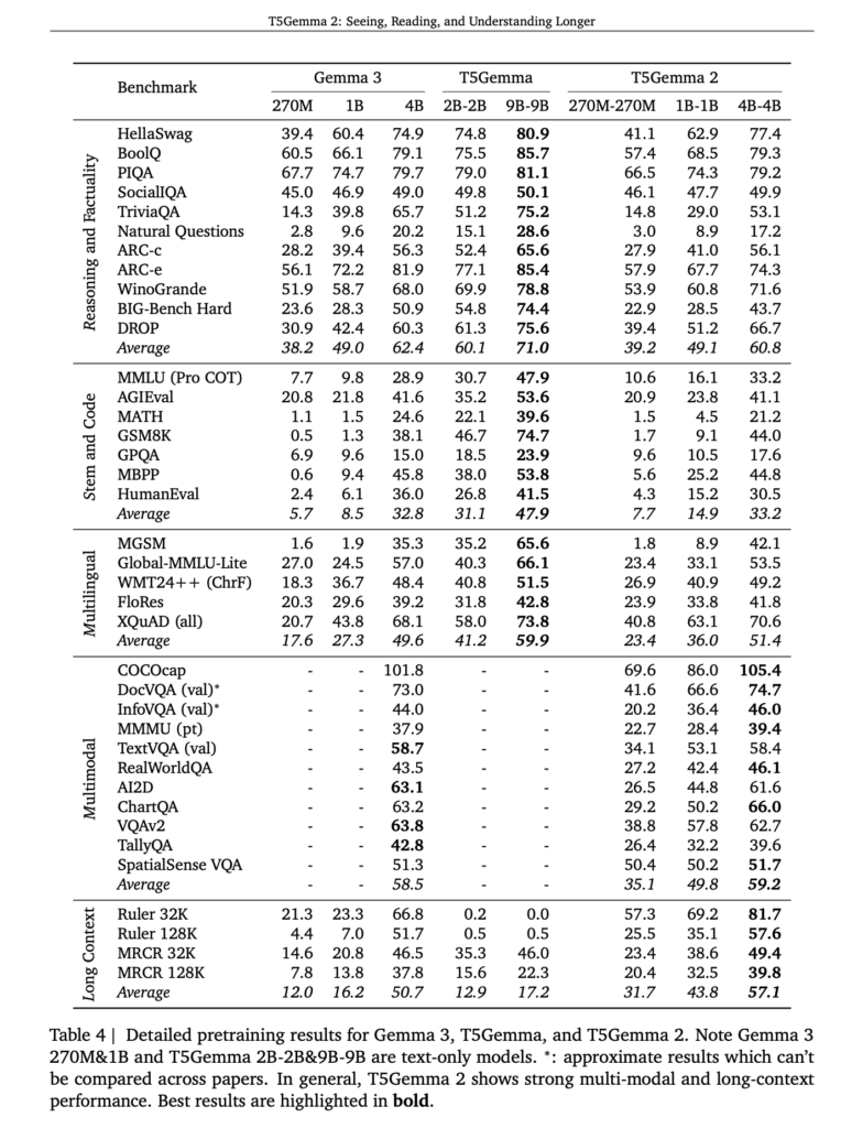 この結果から、T5Gemma 2は完成済みモデルではなく、用途に応じて性能を引き出せる事前学習モデルとして位置付けられます。