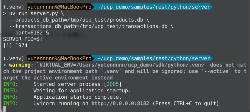 次に、UCPのBusiness APIsをホストするサーバーを起動します。公式例ではポート8182でバックグラウンド起動し、後で停止できるようPIDを変数に入れています。