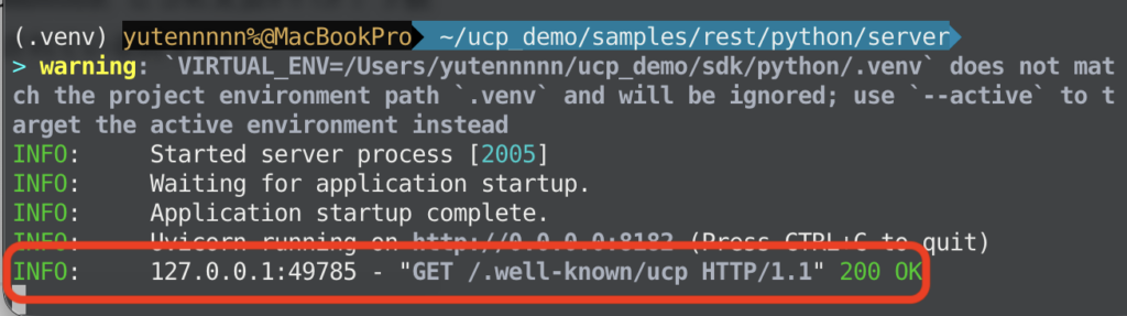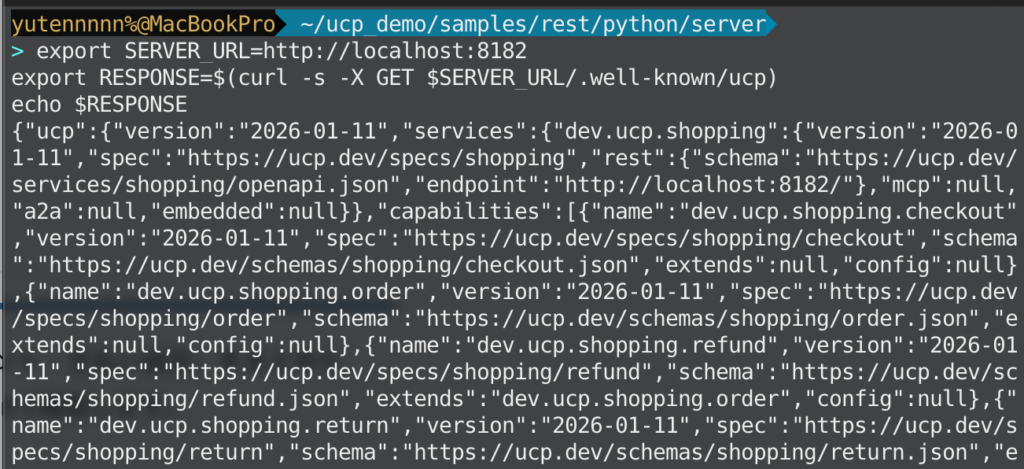 UCPでは、事業者が /.well-known/ucp に「対応サービス・機能・エンドポイント・支払い設定」をまとめたJSONマニフェストを公開し、エージェント側がそれを動的に発見します。ターミナルの別タブで、curlで確認します。