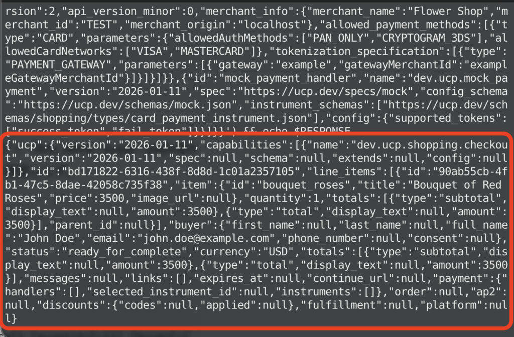 -d '{"line_items":[{"item":{"id":"bouquet_roses","title":"Red Rose"},"quantity":1}],"buyer":{"full_name":"John Doe","email":"john.doe@example.com"},"currency":"USD","payment":{"instruments":[],"handlers":[{"id":"shop_pay","name":"com.shopify.shop_pay","version":"2026-01-11","spec":"https://shopify.dev/ucp/handlers/shop_pay","config_schema":"https://shopify.dev/ucp/handlers/shop_pay/config.json","instrument_schemas":["https://shopify.dev/ucp/handlers/shop_pay/instrument.json"],"config":{"shop_id":"d124d01c-3386-4c58-bc58-671b705e19ff"}},{"id":"google_pay","name":"google.pay","version":"2026-01-11","spec":"https://example.com/spec","config_schema":"https://example.com/schema","instrument_schemas":["https://ucp.dev/schemas/shopping/types/gpay_card_payment_instrument.json"],"config":{"api_version":2,"api_version_minor":0,"merchant_info":{"merchant_name":"Flower Shop","merchant_id":"TEST","merchant_origin":"localhost"},"allowed_payment_methods":[{"type":"CARD","parameters":{"allowedAuthMethods":["PAN_ONLY","CRYPTOGRAM_3DS"],"allowedCardNetworks":["VISA","MASTERCARD"]},"tokenization_specification":[{"type":"PAYMENT_GATEWAY","parameters":[{"gateway":"example","gatewayMerchantId":"exampleGatewayMerchantId"}]}]}]}},{"id":"mock_payment_handler","name":"dev.ucp.mock_payment","version":"2026-01-11","spec":"https://ucp.dev/specs/mock","config_schema":"https://ucp.dev/schemas/mock.json","instrument_schemas":["https://ucp.dev/schemas/shopping/types/card_payment_instrument.json"],"config":{"supported_tokens":["success_token","fail_token"]}}]}}') && echo $RESPONSE