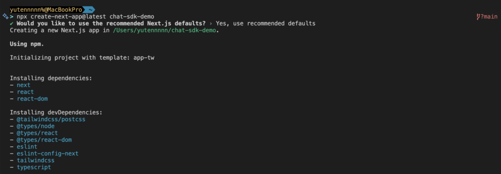 npx create-next-app@latest chat-sdk-demo対話形式でいくつか質問されるので、基本的にYesを選択いただいてOKです。