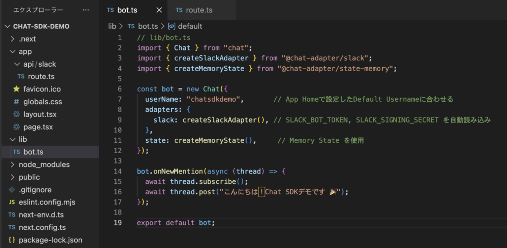Chat SDKのセットアップは比較的シンプルですが、プラットフォーム側のBot登録やトークン取得なども含まれるため、ステップごとに順を追って解説します。