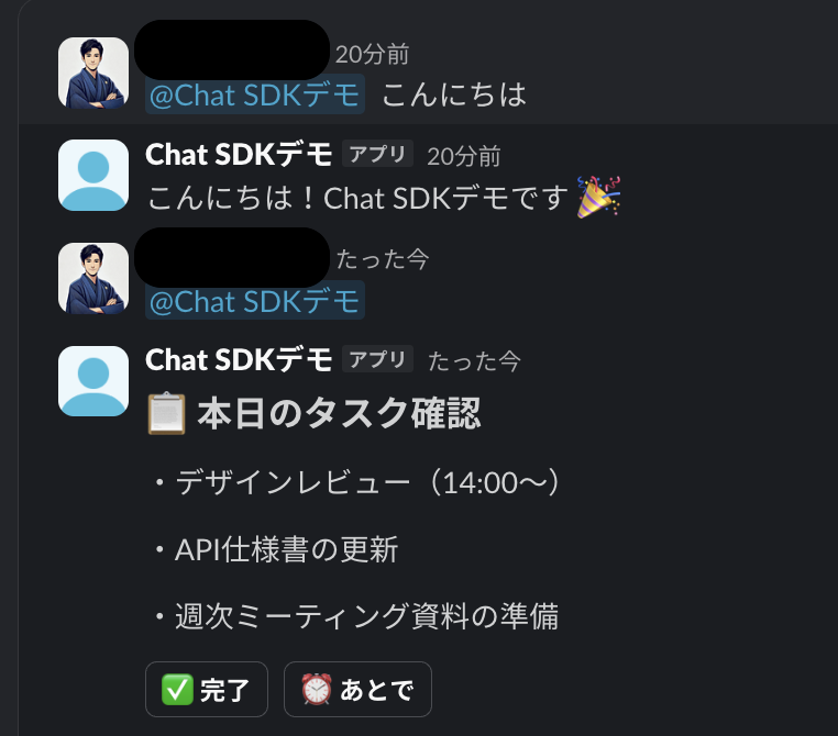 ここからは、実際に構築したSlackボットを使って、Chat SDKならではの機能を検証してみます。